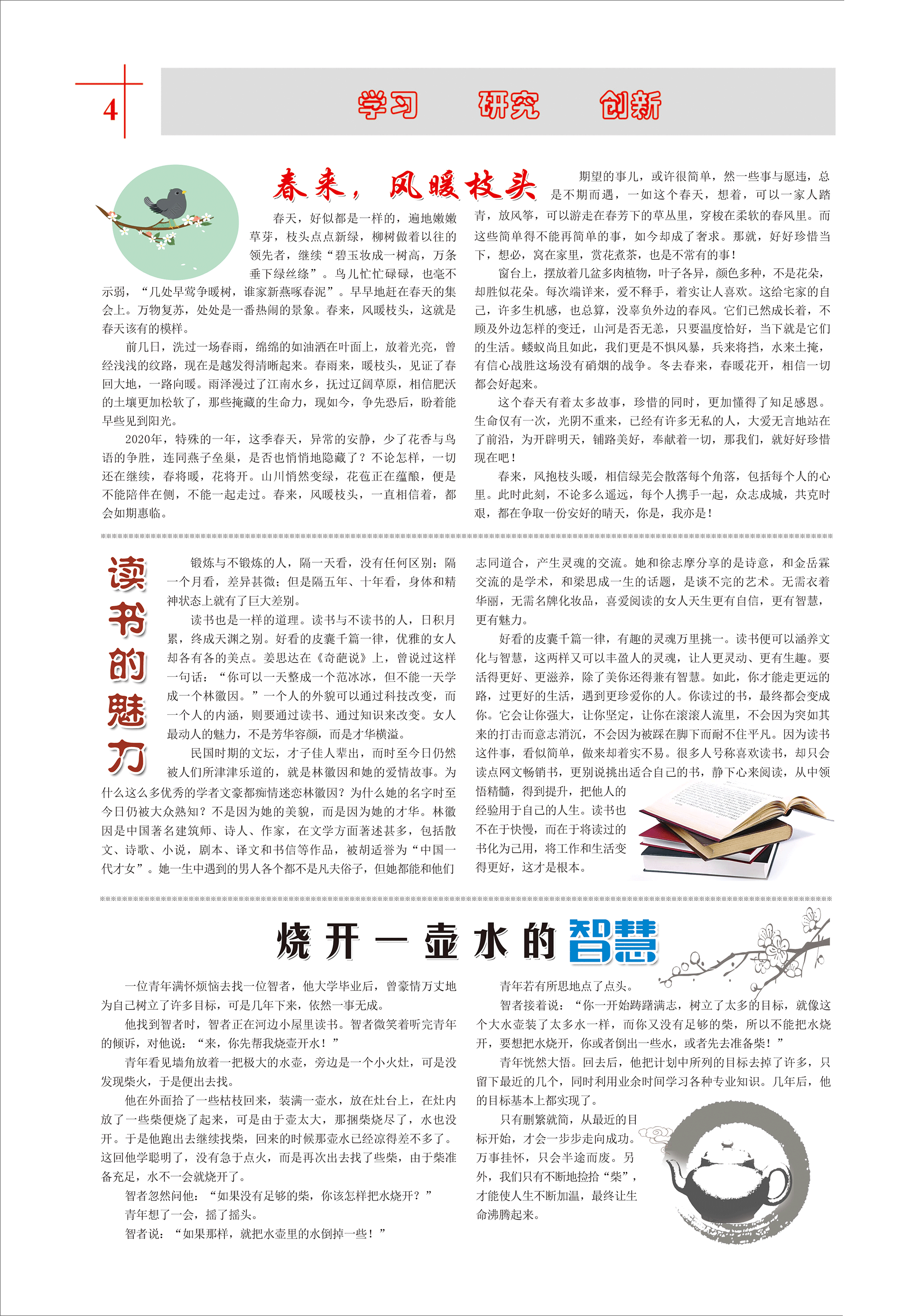 春天,好似都是一樣的,遍地嫩嫩草芽,枝頭點(diǎn)點(diǎn)新綠,柳樹做著以往的領(lǐng)先者,繼續(xù)“碧玉妝成一樹高,萬條垂下綠絲絳”。鳥兒忙忙碌碌,也毫不示弱,“幾處早鶯爭(zhēng)暖樹,誰家新燕啄春泥”。早早地趕在春天的集會(huì)上。萬物復(fù)蘇,處處是一番熱鬧的景象。春來,風(fēng)暖枝頭,這就是春天該有的模樣。