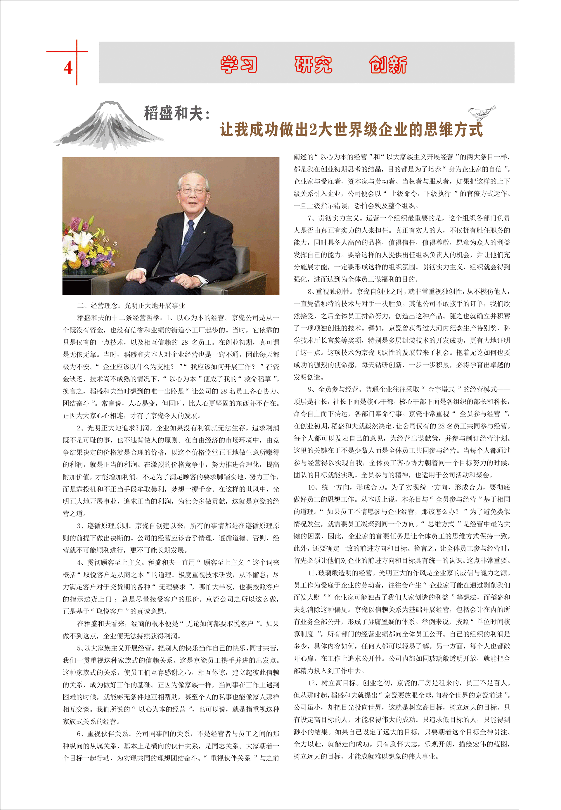 稻盛和夫的十二條經(jīng)營哲學(xué):1、以心為本的經(jīng)營。京瓷公司是從一個(gè)既沒有資金,也沒有信譽(yù)和業(yè)績的街道小工廠起步的。